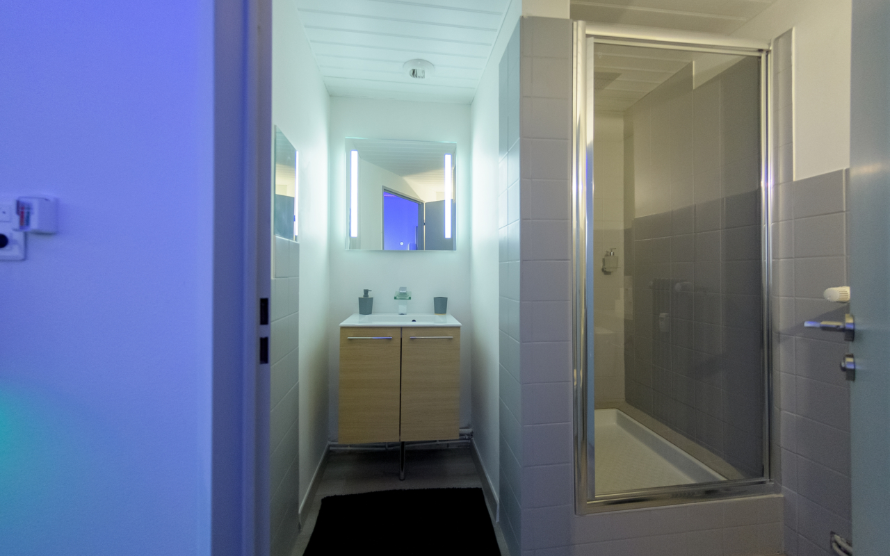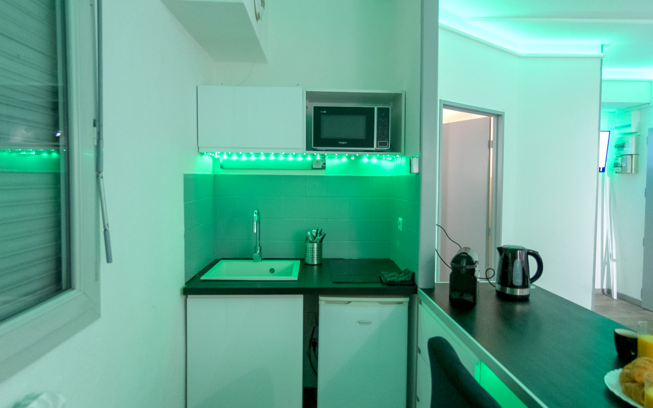 - Cuisine toute équipée (Micro-ondes, cafetière à dosettes, grille-pain, bouilloire, plaques de cuisson induction, casseroles, vaisselle...)